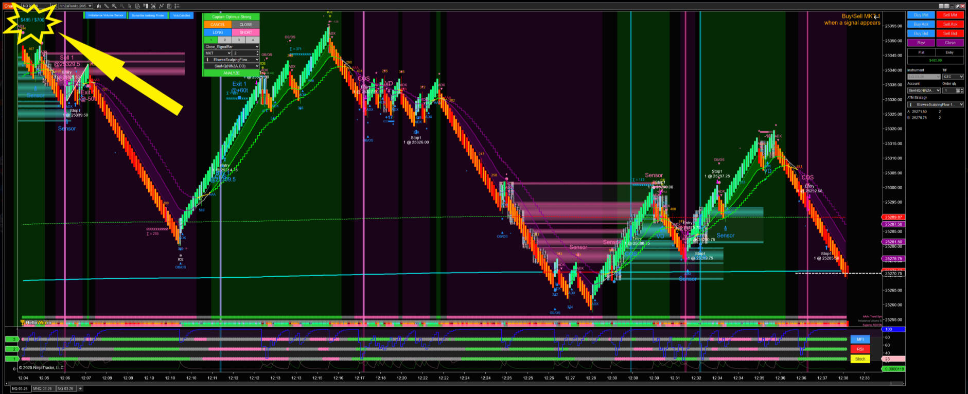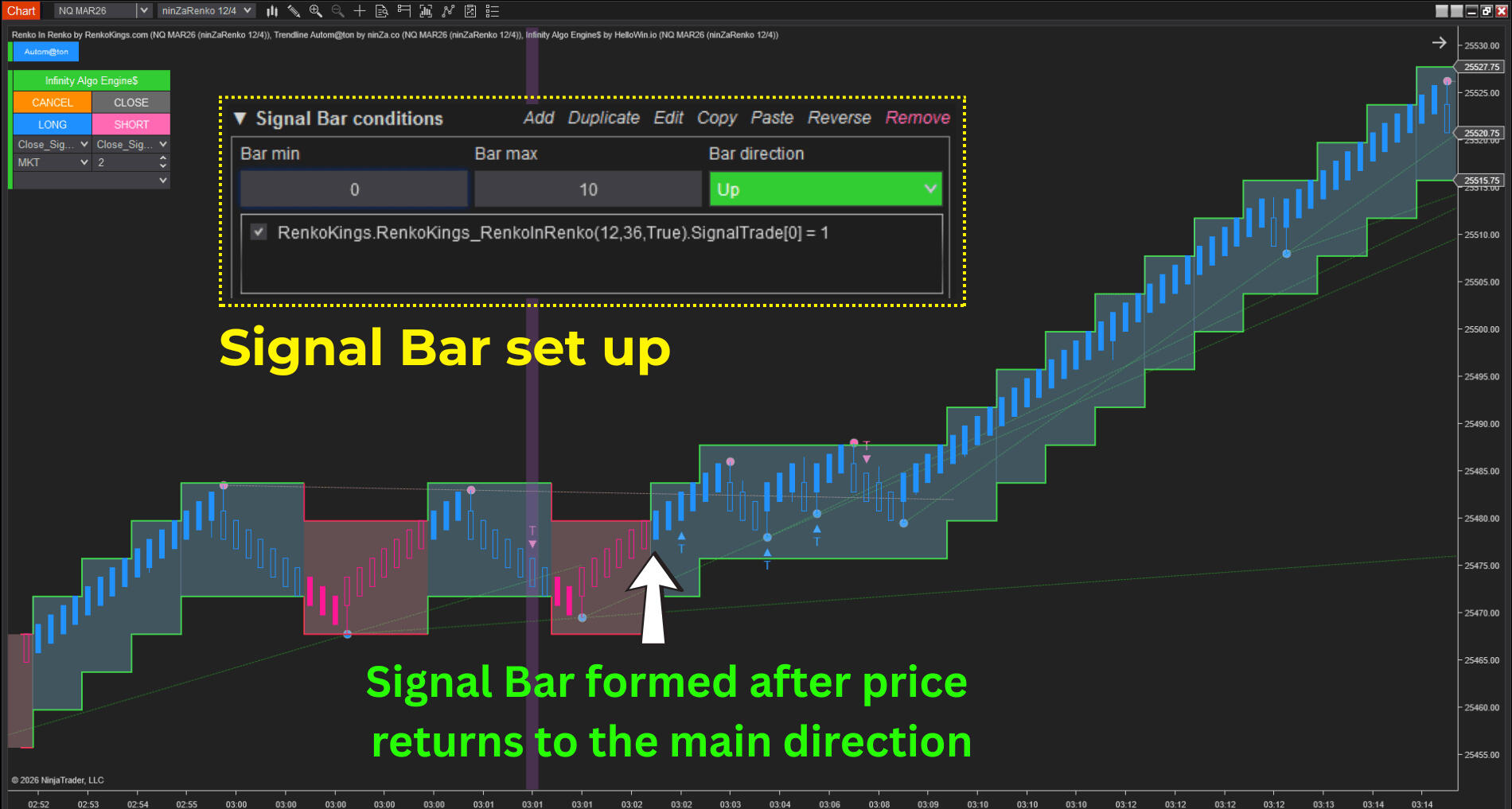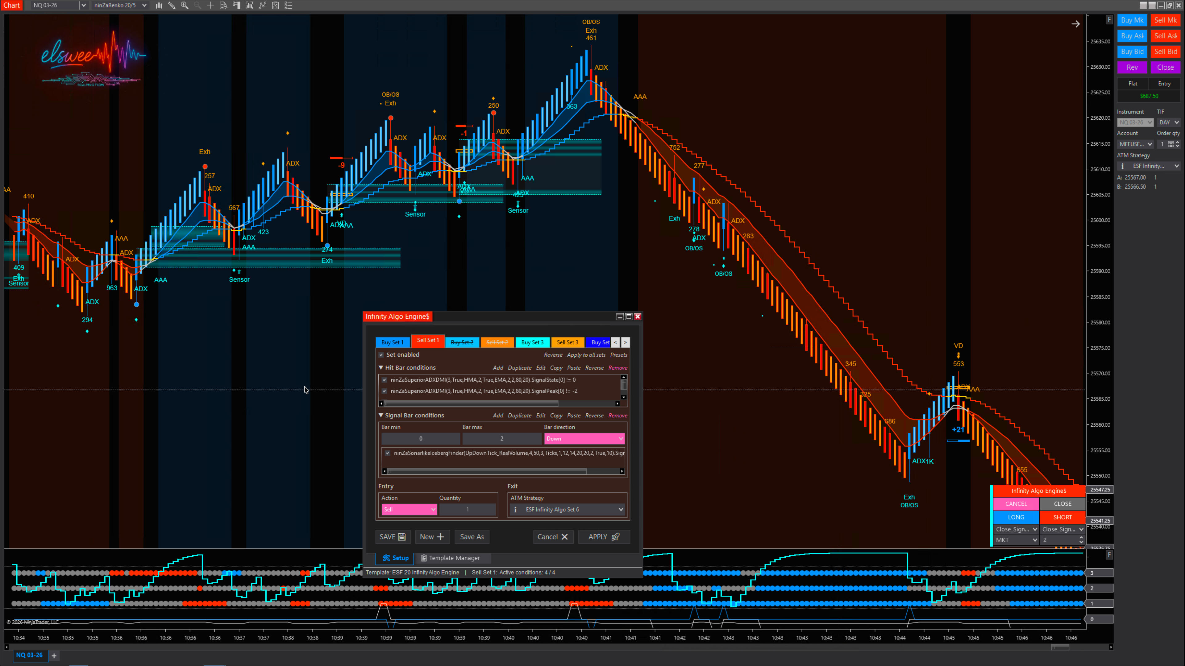 Infinity Algo Engine$ – enables rule-based automated execution by structuring multi-condition logic, signal confirmation, and custom ATM trade management.