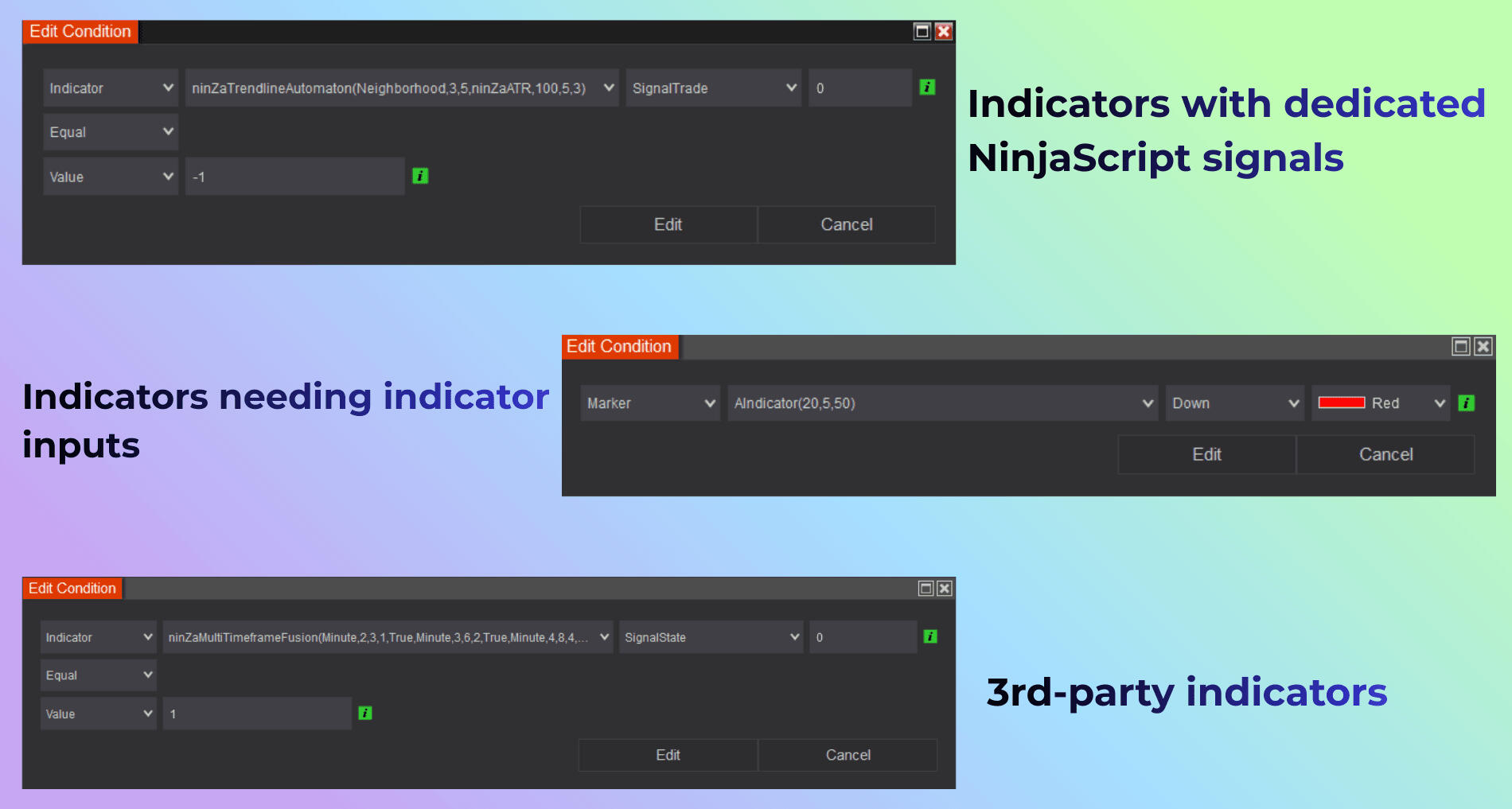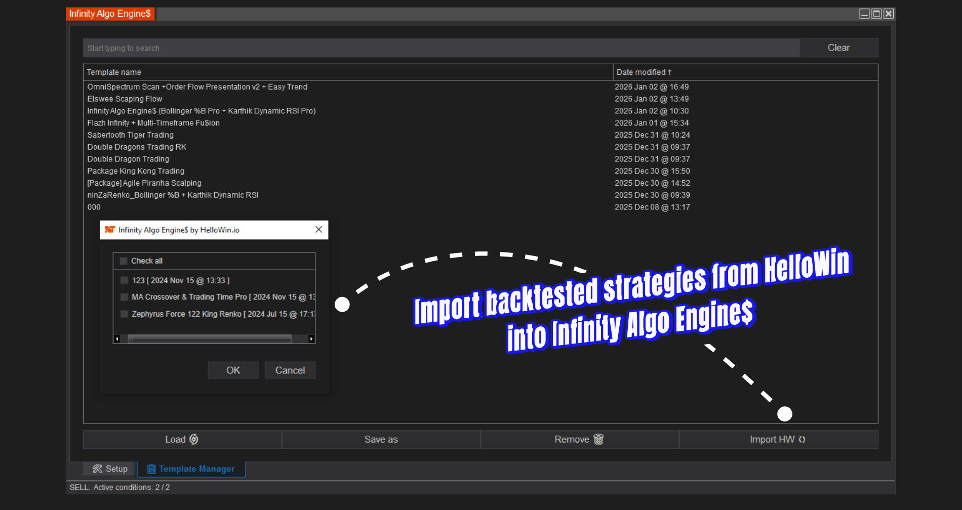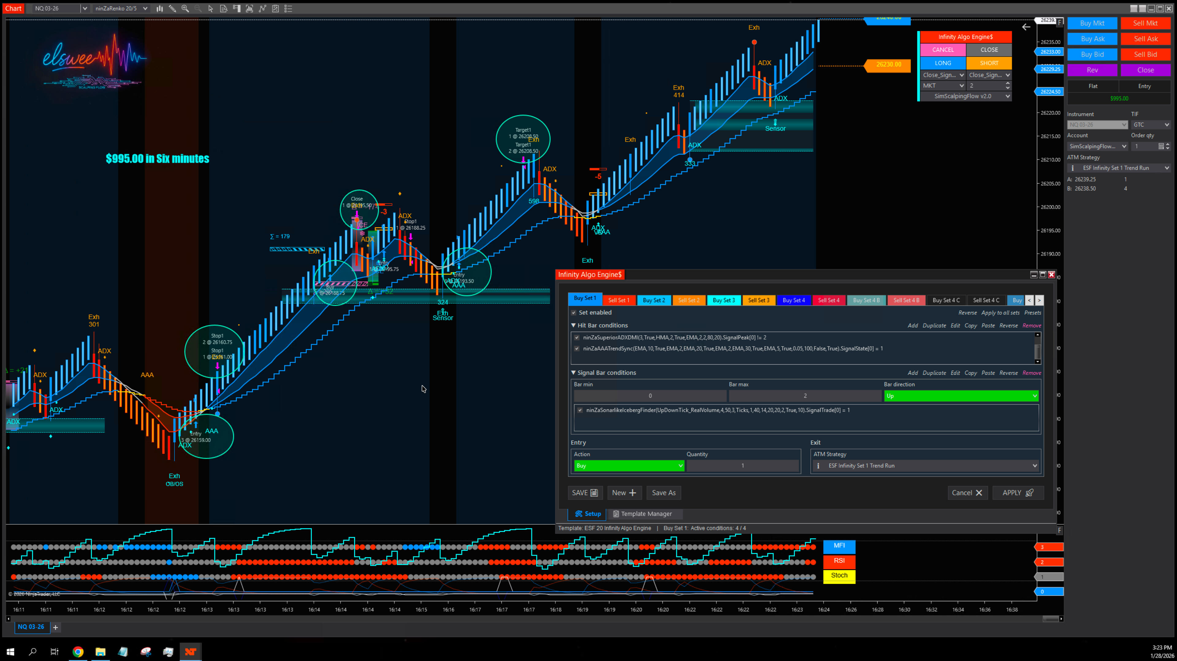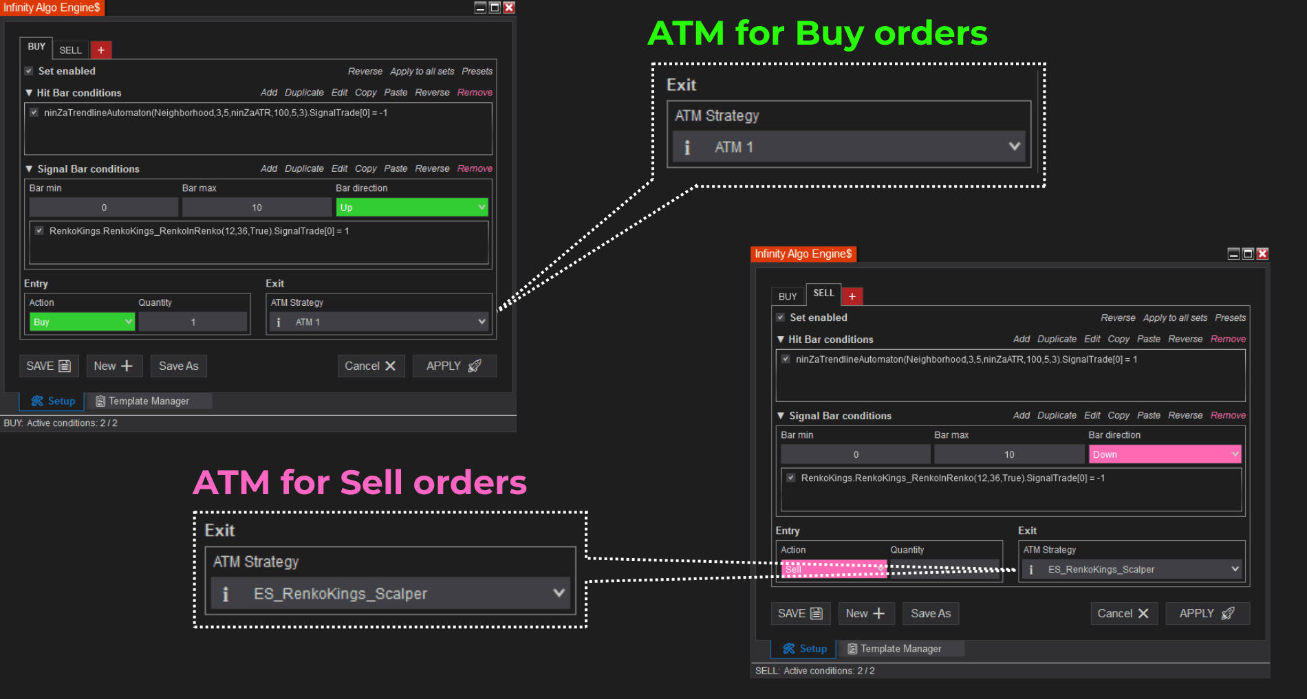 Infinity Algo Engine$ – enables rule-based automated execution by structuring multi-condition logic, signal confirmation, and custom ATM trade management.